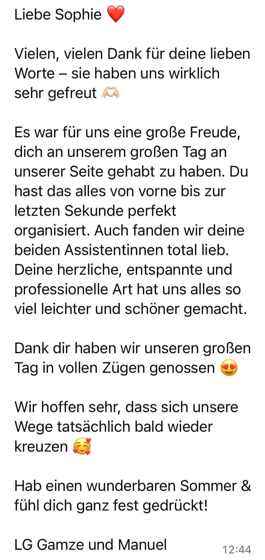 Danke nochmals für alles hat alles sehr gut funktioniert war eine perfekte wunderschöne Hochzeit.